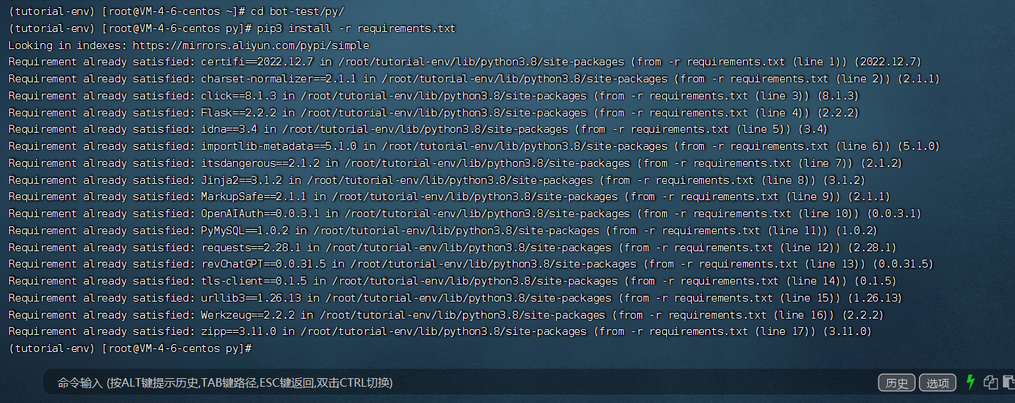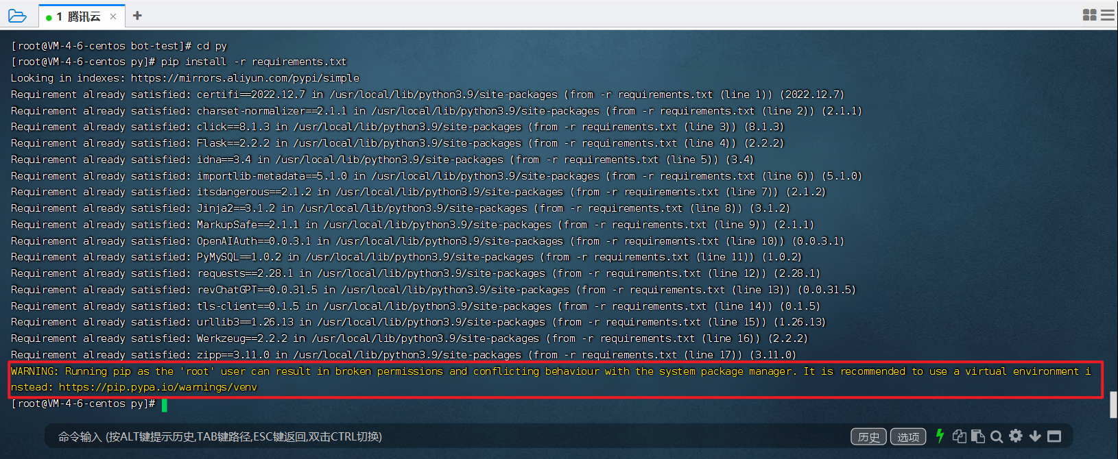 cd /bot-test/py #这里的/bot-test/py是你存放文件的地方 pip install -r requirements.txt 或 pip3 install -r requirements.txt复制