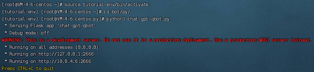 screen -S pybot source tutorial-env/bin/activate #需要进入虚拟环境 cd /cd /bot-test/py #这里的/bot-test/py是你存放文件的地方 python chat-gpt-qbot.py 或 python3 chat-gpt-qbot.py复制