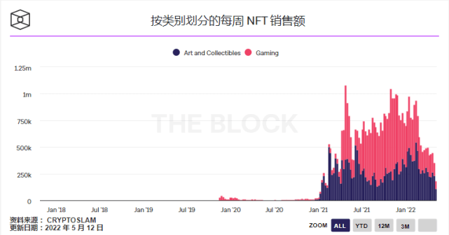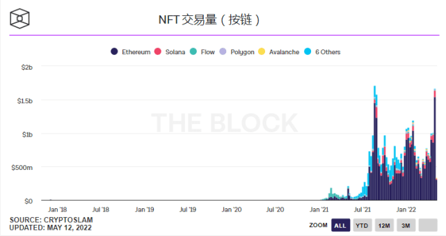 据Coingecko最新数据显示,截至2022年5月12日,NFT总市值约为169亿美元,日交易量超110亿美元。市场排名前三的NFT分别为Flow、ApeCoin、Axie Infinity,均为数十亿美元。