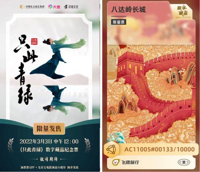 2022年3月3日,中国东方演艺集团携手大麦、灵境文化首推中国演出行业数字藏品《只此青绿》数字藏品纪念票。4月30日,飞猪度假官方旗舰店发售八达岭长城门票数字藏品,藏品限量一万份。