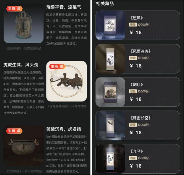 例如,2022年农历新年前夕,24家博物馆(院)在支付宝旗下的数字藏品平台鲸探发布源自“虎文物”“十二生肖文物”及“镇馆之宝”的3D数字藏品。4月21日,徐悲鸿美术馆、时代悲鸿文化艺术中心联合鲸探首次推出徐悲鸿限量数字藏品。